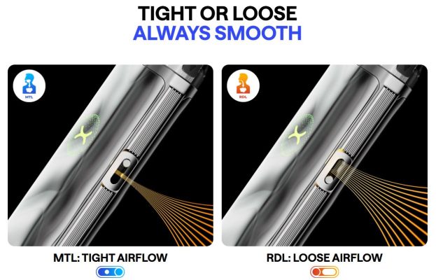 La pestaña lateral facilita ajustar la entrada de aire para acercar la experiencia a una calada más cerrada tipo MTL o más abierta tipo RDL.
