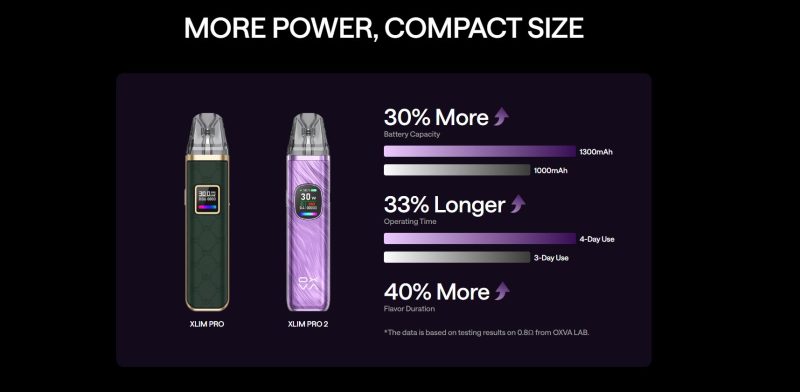 El kit Xlim Pro 2 de Oxva es un dispositivo que se diferencia de los modelos anteriores, ya que ofrece mayor potencia gracias a que su batería interna es de 1300mAh y 30W, lo que hace que no sea necesario cargarlo durante 4 días.